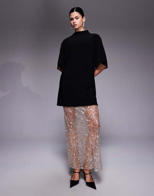 ASOS DESIGN – 2-i-1 – Champagnefärgad t-shirt med korta ärmar och paljettprydd spetskjol