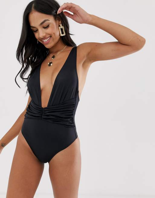 ASOS DESIGN – Baddräkt med djup urringning och ryschad framdel