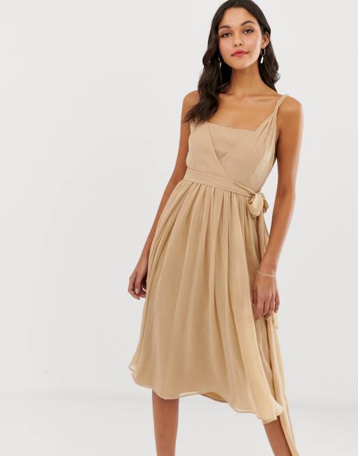 ASOS DESIGN – Balklänning i mjuk chiffong och midimodell med fyrkantig halsringning och virat band