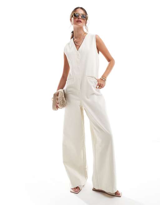 ASOS DESIGN – Beige, ärmlös, ledig jumpsuit i denim