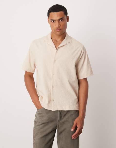 ASOS DESIGN – Beige, boxig skjorta i bäckebölja med platt krage