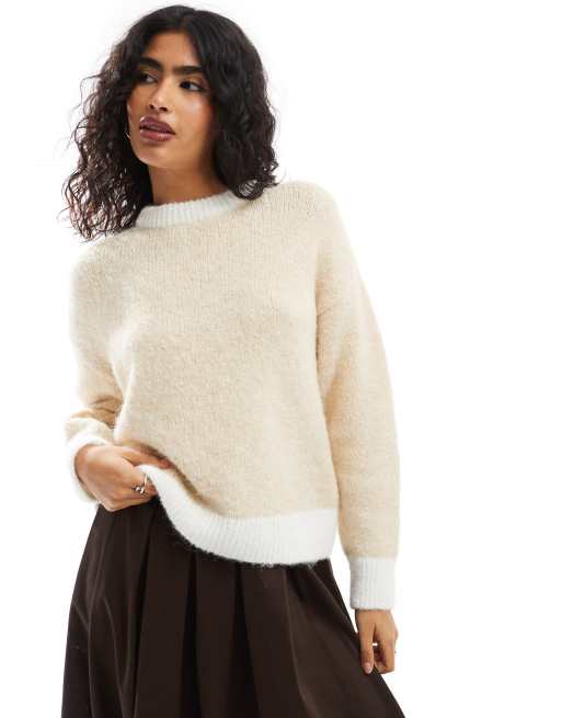 ASOS DESIGN – Beige, fluffigt stickad tröja i yllemix med gräddvita detaljer