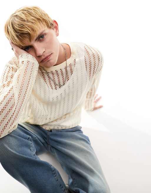 ASOS DESIGN – Beige, långärmad t-shirt i två lager mesh