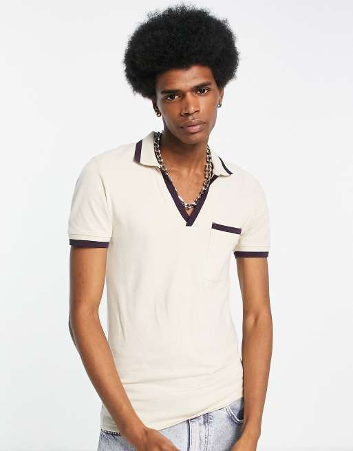 ASOS DESIGN – Beige pikétröja med platt krage och ficka