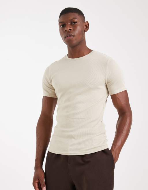 ASOS DESIGN – Beige, ribbad bas-t-shirt i muscle fit