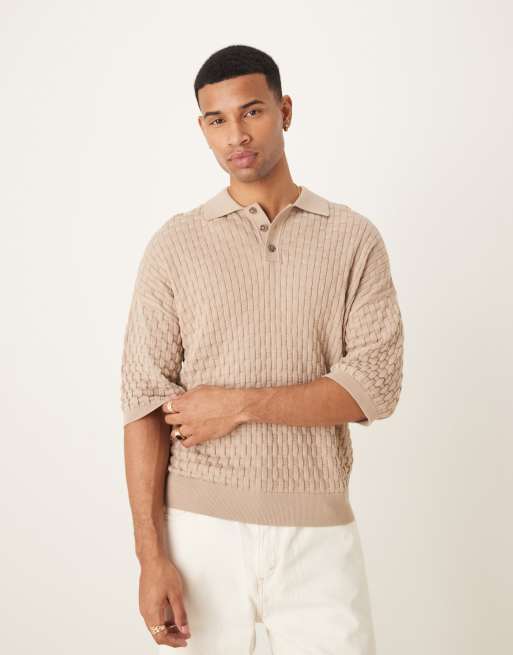 ASOS DESIGN – Beige, stickad pikétröja med avslappnad och 3/4-långa ärmar