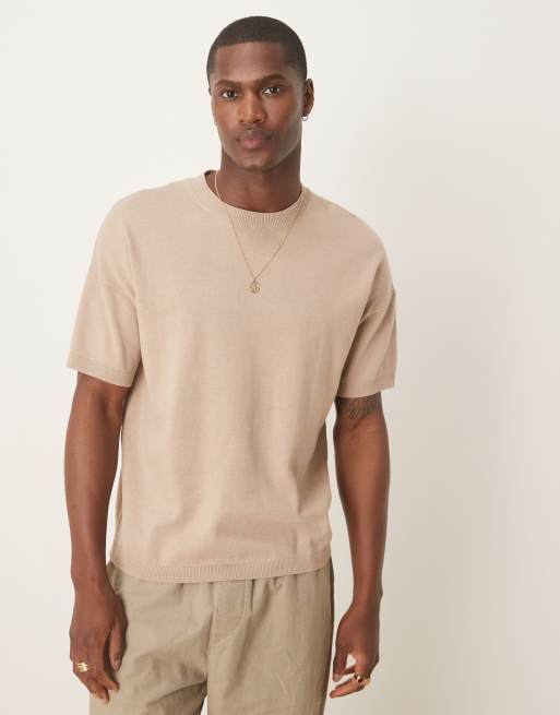 ASOS DESIGN – Beige, stickad t-shirt i medelkraftig bomull med avslappnad passform