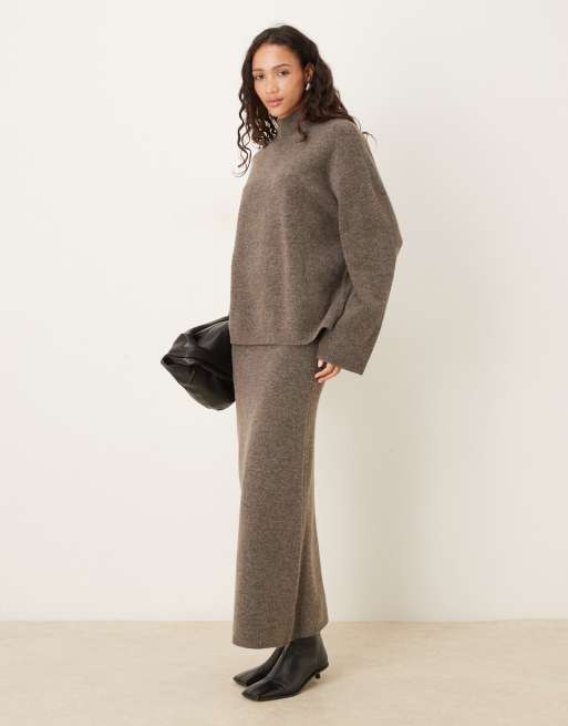ASOS DESIGN – Beige, stickat set med lång tröja med ståkrage och maxikjol