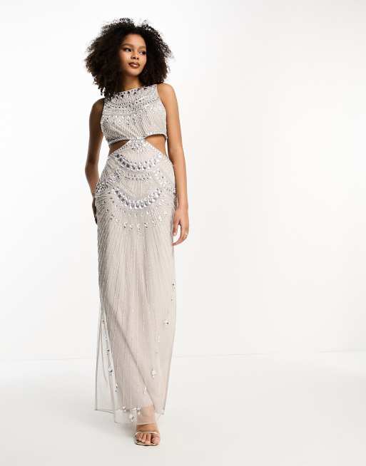 ASOS DESIGN – Beige, strassprydd maxiklänning i mesh med utskurna detaljer