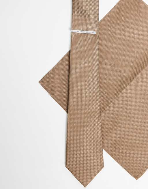 ASOS DESIGN – Beige, strukturerat set i satin med slips, bröstnäsduk och slipsnål