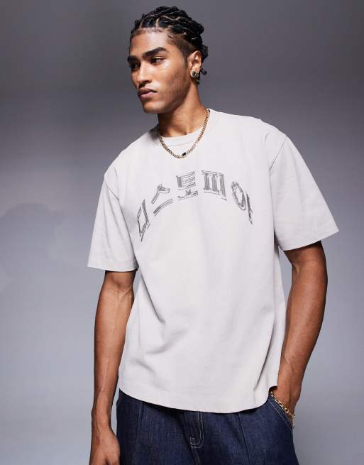 ASOS DESIGN – Beige, tvättad, kraftig t-shirt med avslappnad, boxig passform och texttryck