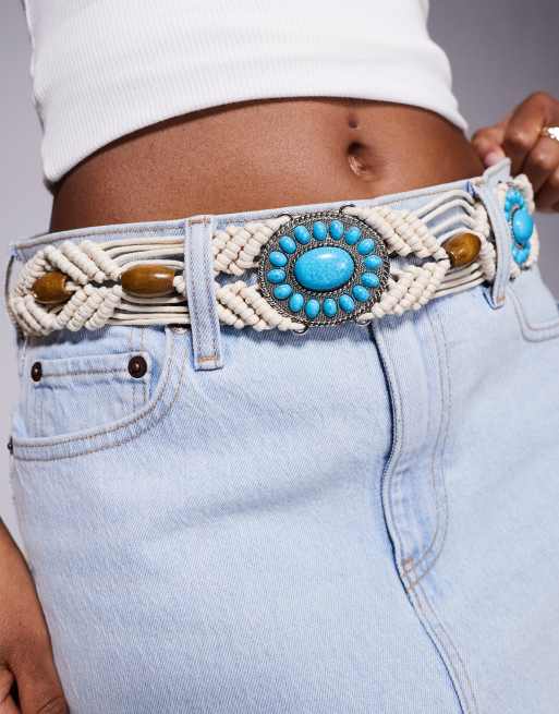 ASOS DESIGN – Beigt makraméskärp med turkosa stenar