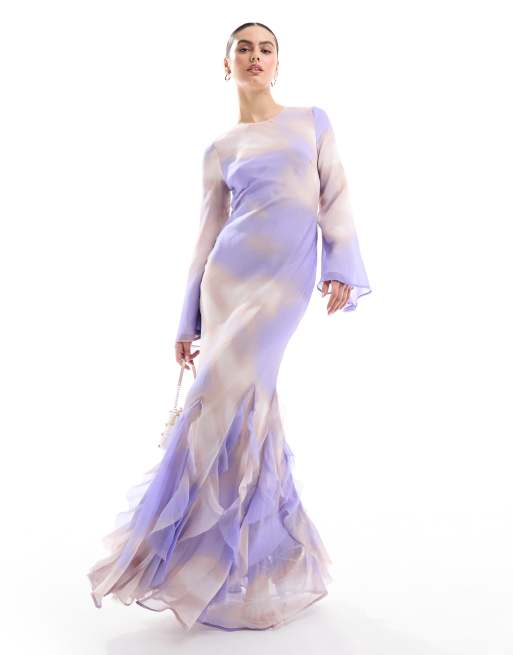 ASOS DESIGN – Blå, abstrakt mönstrad, diagonalskuren maxiklänning med långa ärmar och volanger i chiffong