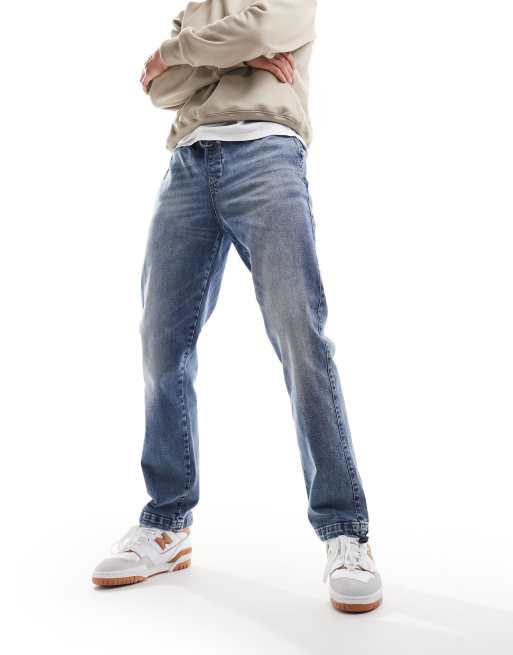ASOS DESIGN – Blå jeans i mjukismodell med resårmidja och mellanljus tvätt