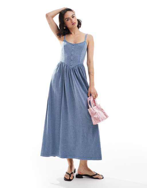 ASOS DESIGN – Blå, jeanstvättad midiklänning med smala axelband, knappar och prinsessöm framtill och vid kjol