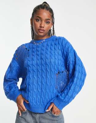 ASOS DESIGN – Blå, kabelstickad, sliten tröja i oversize med håldetaljer