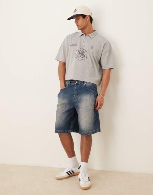 ASOS DESIGN – Blå, långa jeansshorts med veck på ficka och mellanljus tvätt