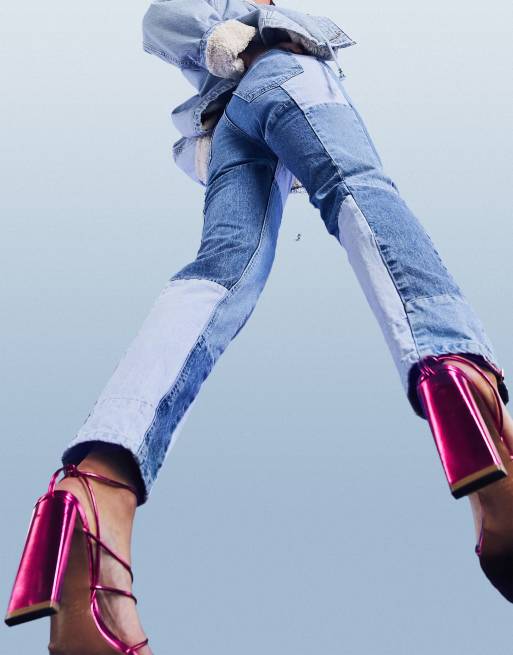 ASOS DESIGN – Blå, lapptäcksmönstrade och raka jeans med medelhög midja