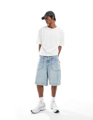 ASOS DESIGN – Blå, ljustvättade jeansshorts i lång modell