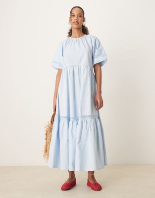 ASOS DESIGN – Blå maxiklänning i präriestil med rund halsringning, puffärmar och spetsdetaljer