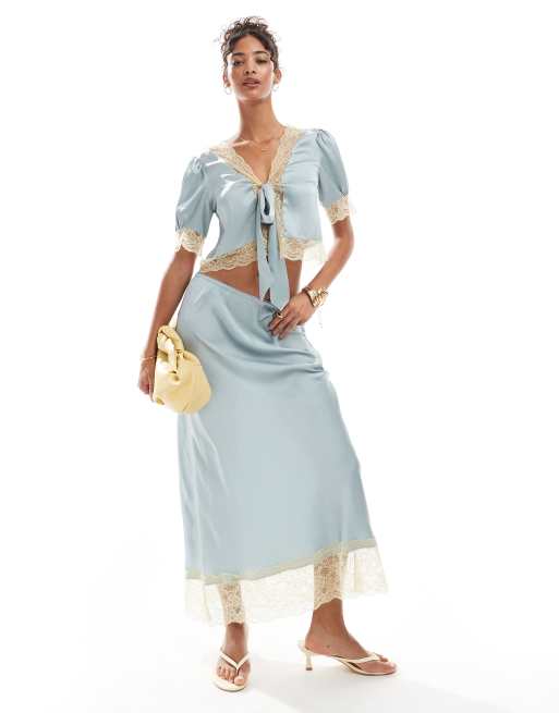 ASOS DESIGN – Blå midikjol i satin med spetskant, del av set