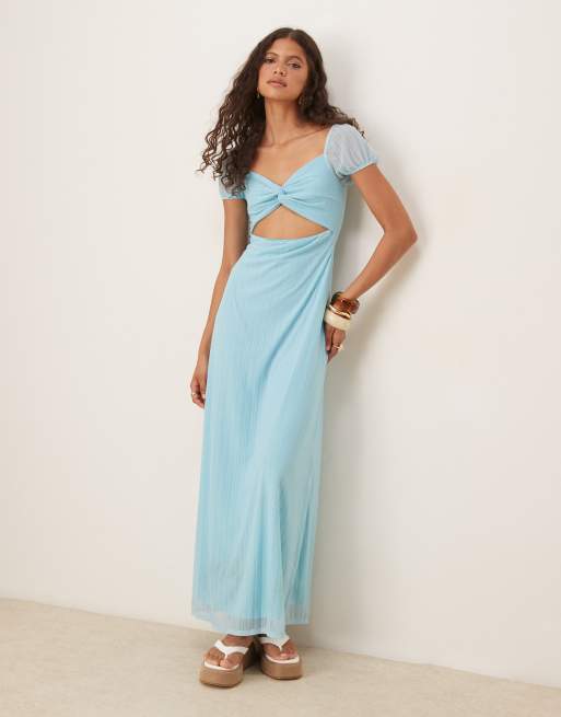 ASOS DESIGN – Blå midiklänning i texturerad mesh med snurrad knut framtill och puffärmar