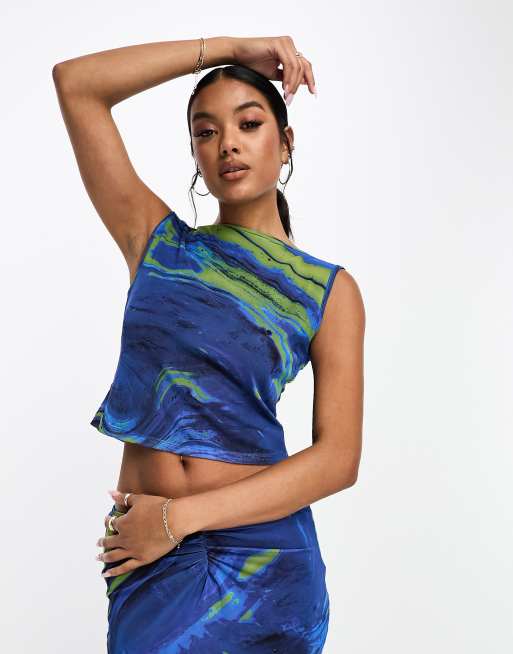 ASOS DESIGN – Blå, mönstrad topp i mesh med rak halsringning och öppen rygg, del av set