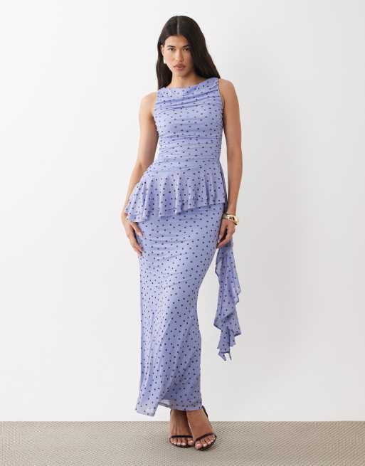 ASOS DESIGN – Blå, prickig maxiklänning i mesh med rysch och volangdetaljer