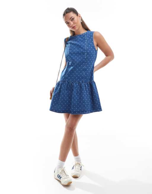 ASOS DESIGN – Blå, prickig miniklänning i denim med sänkt midja
