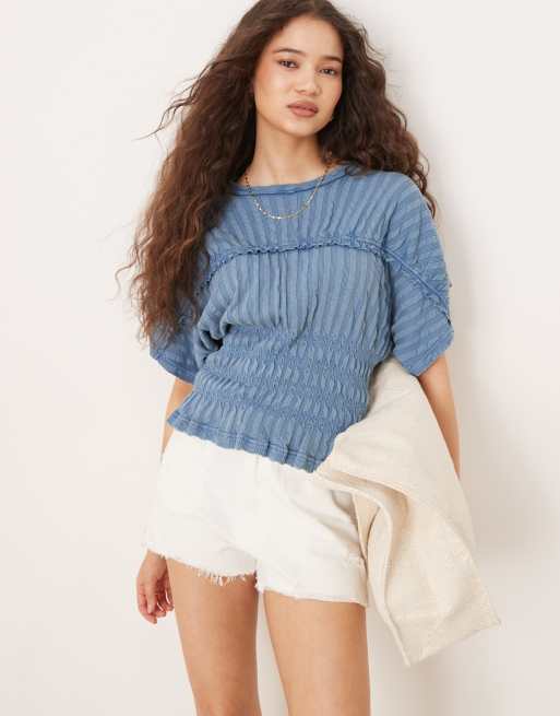 ASOS DESIGN – Blå, ribbad, texturerad t-shirt med smockad midja