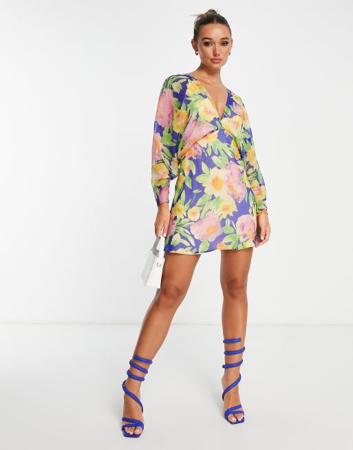 ASOS DESIGN – Blå, storblommig miniklänning med pingvinärmar
