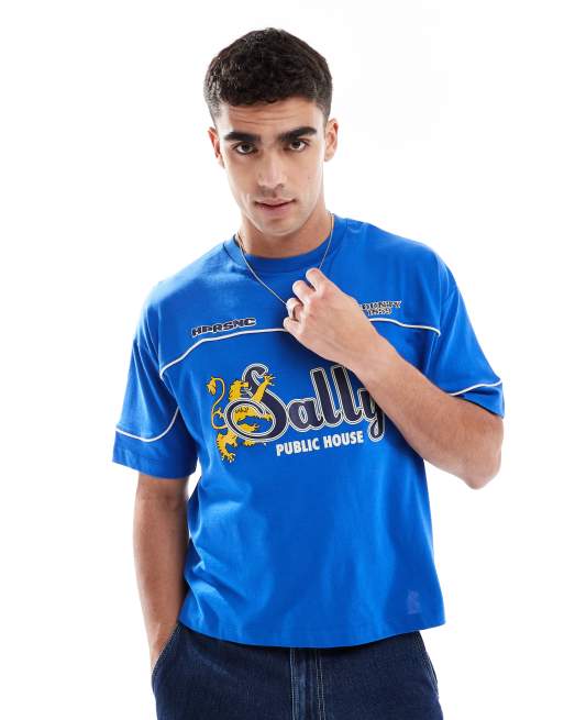 ASOS DESIGN – Blå t-shirt i oversize med boxig passform och sportigt tryck