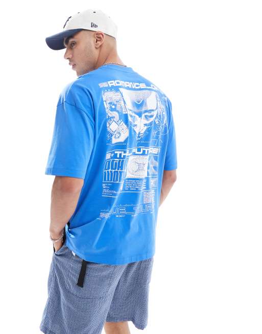 ASOS DESIGN – Blå t-shirt i oversize med mönster baktill