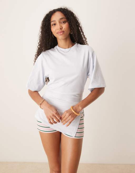ASOS DESIGN – Blå t-shirt med indragen midja och asymmetrisk fåll