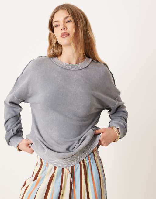 ASOS DESIGN – Blå, tvättad, borstad sweatshirt med synliga sömmar och snurrad detalj baktill