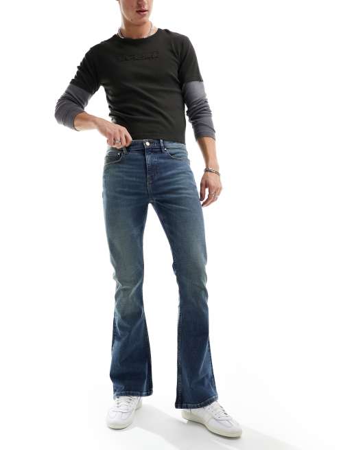ASOS DESIGN – Blå, utsvängda jeans med tvättad finish