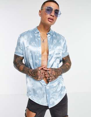 ASOS DESIGN – Blåblommig, satinskjorta i jacquard med regular passform