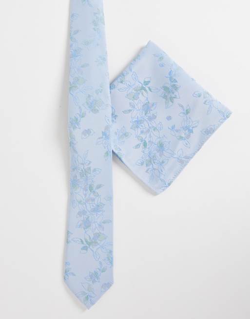 ASOS DESIGN – Blåblommig smal slips med bröstnäsduk