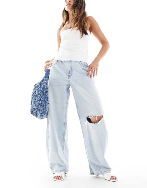 ASOS DESIGN – Blekblå jeans med barrelben, hög midja och revor
