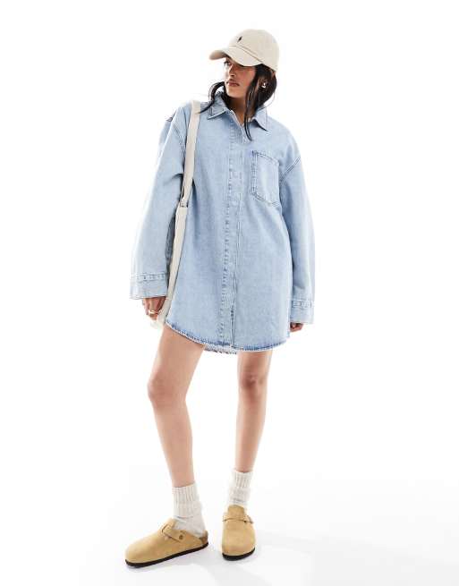 ASOS DESIGN – Blekblå mini-skjortklänning i denim med fickor framtill