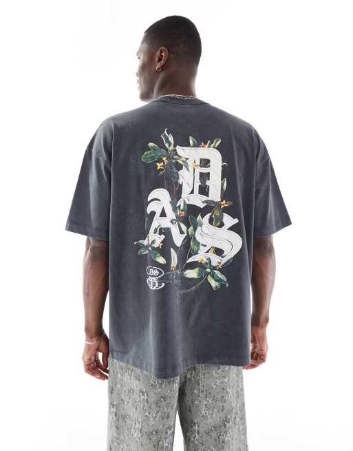 ASOS DESIGN – Bleksvart, kraftig t-shirt i oversize med blommigt texttryck