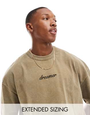 ASOS DESIGN – Blekt kakigrön, kraftig t-shirt i oversize med texttryck på bröstet