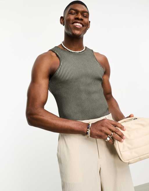 ASOS DESIGN – Blekt khakigrön, ribbad body i muscle fit