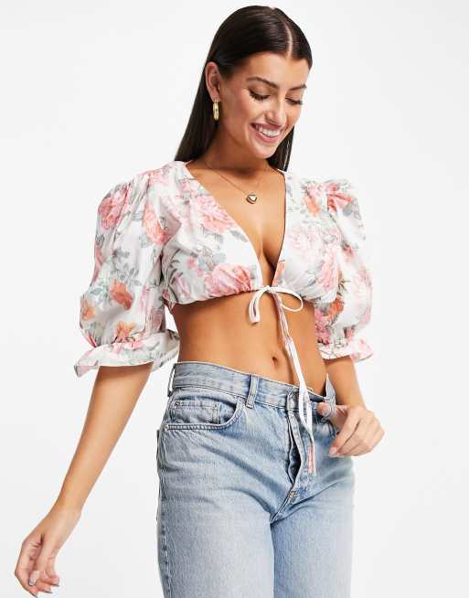 ASOS DESIGN – Blommig crop top i bomull med puffärmar