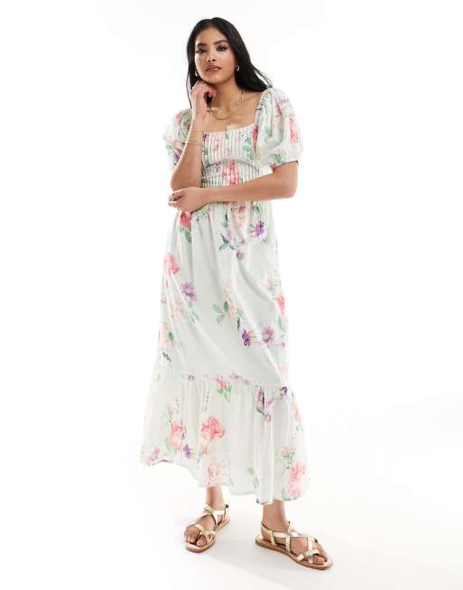 ASOS DESIGN – Blommig, dobbyvävd midiklänning i bomull med snörning baktill