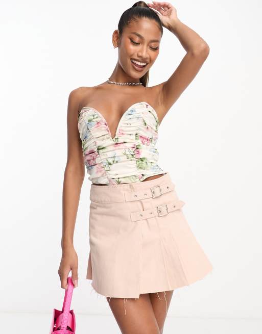 ASOS DESIGN – Blommig korsettopp med djup urringning utan axelband