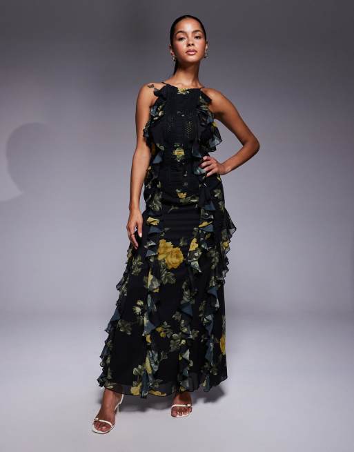 ASOS DESIGN – Blommig maxiklänning med hålmönster och volang