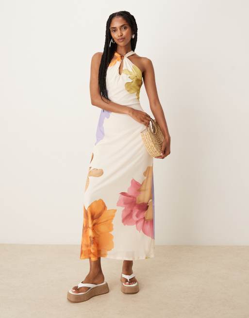 ASOS DESIGN – Blommig midiklänning med metalldetalj, halterneck och nyckelhålsöppning i mesh