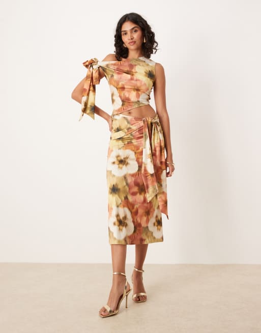 ASOS DESIGN – Blommig midiklänning med sänkt axel och knytdetalj