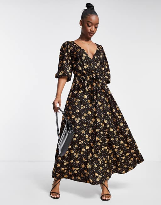 ASOS DESIGN – Blommig och prickig midiklänning med omlottdesign framtill